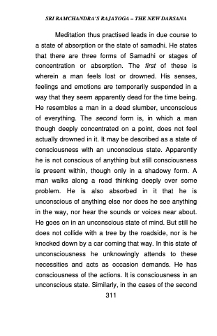 Meditation thus practised leads in due course to a state of absorption or the state of samadhi. He states that there are three forms of Samadhi or stages of concentration or absorption. The first of these is wherein a man feels lost or drowned. His senses, feelings and emotions are temporarily suspended in a way that they seem apparently dead for the time being. He resembles a man in a dead slumber, unconscious of everything. The second form is, in which a man though deeply concentrated on a point, does not feel actually drowned in it. It may be described as a state of consciousness with an unconscious state. Apparently he is not conscious of anything but still consciousness is present within, though only in a shadowy form. A man walks along a road thinking deeply over some problem. He is also absorbed in it that he is unconscious of anything else nor does he see anything in the way, nor hear the sounds or voices near about. He goes on in an unconscious state of mind. But still he does not collide with a tree by the roadside, nor is he knocked down by a car coming that way. In this state of unconsciousness he unknowingly attends to these necessities and acts as occasion demands. He has consciousness of the actions. It is consciousness in an unconscious state. Similarly, in the cases of the second