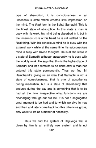 type of absorption, it is consciousness in an unconscious state which creates little impression on the mind. The third form is the Sahaj Samadhi. This is the finest state of absorption. In this state a man is busy with his work, his mind being absorbed in it, but in the innermost core of his heart he is still settled on the Real thing. With his conscious mind he is busy with the external work while at the same time his subconscious mind is busy with Divine thoughts. He is all the while in a state of Samadhi although apparently he is busy with the worldly work. He says that this is the highest type of Samadhi and little remains to be done after a man has entered this state permanently. Thus we find Sri Ramchandra giving us an idea that Samadhi is not a state of consciousness, that is one of absorbency during meditation, but is a state of absorbency that endures during the day and is something that is to be had all the time irrespective what functions we are discharging through out our life. It is not a segregated great moment to be had and to which we dive in now and then and later come back too this otherwise gross, dirty wakeful life as a matter of necessity.