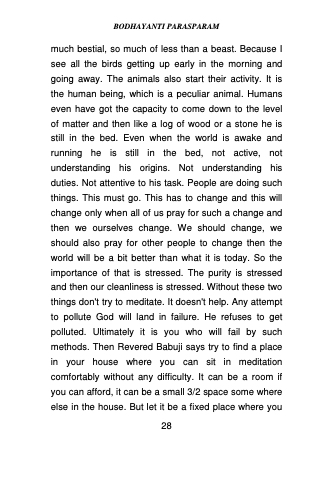 much bestial, so much of less than a beast. Because I see all the birds getting up early in the morning and going away. The animals also start their activity. It is the human being, which is a peculiar animal. Humans even have got the capacity to come down to the level of matter and then like a log of wood or a stone he is still in the bed. Even when the world is awake and running he is still in the bed, not active, not understanding his origins. Not understanding his duties. Not attentive to his task. People are doing such things. This must go. This has to change and this will change only when all of us pray for such a change and then we ourselves change. We should change, we should also pray for other people to change then the world will be a bit better than what it is today. So the importance of that is stressed. The purity is stressed and then our cleanliness is stressed. Without these two things don't try to meditate. It doesn't help. Any attempt to pollute God will land in failure. He refuses to get polluted. Ultimately it is you who will fail by such methods. Then Revered Babuji says try to find a place in your house where you can sit in meditation comfortably without any difficulty. It can be a room if you can afford, it can be a small 3/2 space some where else in the house. But let it be a fixed place where you