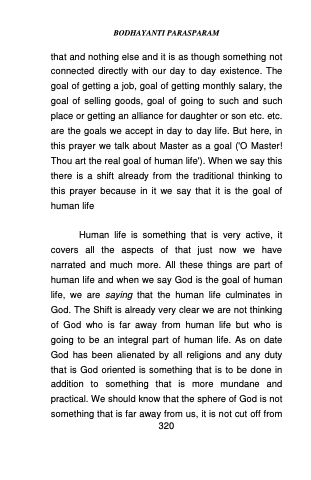 that and nothing else and it is as though something not connected directly with our day to day existence. The goal of getting a job, goal of getting monthly salary, the goal of selling goods, goal of going to such and such place or getting an alliance for daughter or son etc. etc. are the goals we accept in day to day life. But here, in this prayer we talk about Master as a goal ('O Master! Thou art the real goal of human life'). When we say this there is a shift already from the traditional thinking to this prayer because in it we say that it is the goal of human life