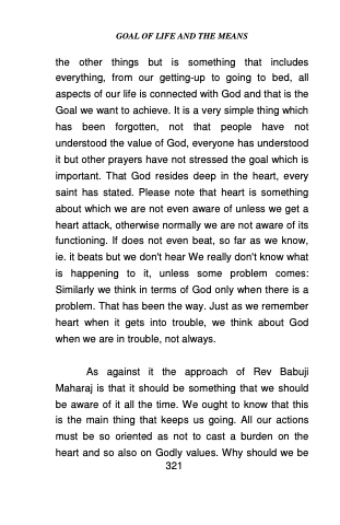 the other things but is something that includes everything, from our getting-up to going to bed, all aspects of our life is connected with God and that is the Goal we want to achieve. It is a very simple thing which has been forgotten, not that people have not understood the value of God, everyone has understood it but other prayers have not stressed the goal which is important. That God resides deep in the heart, every saint has stated. Please note that heart is something about which we are not even aware of unless we get a heart attack, otherwise normally we are not aware of its functioning. If does not even beat, so far as we know, ie. it beats but we don't hear We really don't know what is happening to it, unless some problem comes: Similarly we think in terms of God only when there is a problem. That has been the way. Just as we remember heart when it gets into trouble, we think about God when we are in trouble, not always.