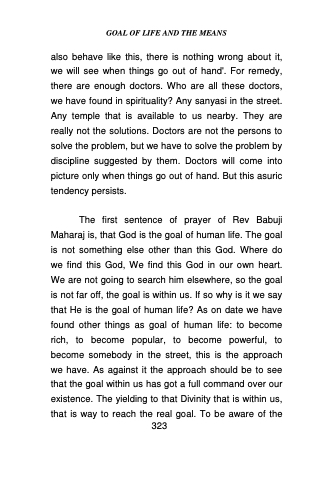 The first sentence of prayer of Rev Babuji Maharaj is, that God is the goal of human life. The goal is not something else other than this God. Where do we find this God, We find this God in our own heart. We are not going to search him elsewhere, so the goal is not far off, the goal is within us. If so why is it we say that He is the goal of human life? As on date we have found other things as goal of human life: to become rich, to become popular, to become powerful, to become somebody in the street, this is the approach we have. As against it the approach should be to see that the goal within us has got a full command over our existence. The yielding to that Divinity that is within us,