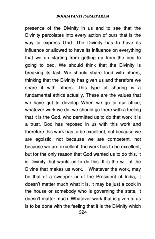 presence of the Divinity in us and to see that the Divinity percolates into every action of ours that is the way to express God. The Divinity has to have its influence or allowed to have its influence on everything that we do starting from getting up from the bed to going to bed. We should think that the Divinity is breaking its fast. We should share food with others, thinking that the Divinity has given us and therefore we share it with others. This type of sharing is a fundamental ethics actually. These are the values that we have got to develop When we go to our office, whatever work we do, we should go there with a feeling that it is the God, who permitted us to do that work It is a trust, God has reposed in us with this work and therefore this work has to be excellent, not because we are egoistic, not because we are competent, not because we are excellent, the work has to be excellent, but for the only reason that God wanted us to do this, it is Divinity that wants us to do this. It is the will of the Divine that makes us work. Whatever the work, may be that of a sweeper or of the President of India, it doesn’t matter much what it is, it may be just a cook in the house or somebody who is governing the state, it doesn’t matter much. Whatever work that is given to us