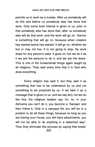 permits us to work as a trustee. After us somebody will do this and before us somebody else has done that work. Only some brief interval is given to us, prior to that somebody else has done that, after us somebody else will do that work, and the work will go on. 'Karma' is something that will go on, because when creation has started karma has started. It will go on, whether we live or may not live. It is not going to stop. No work stops for any person's sake. It goes on, but we do it as if we are the persons to do it, and we are the doers. This is one of the fundamental things again taught by all religions. They said every time that it is God who does everything.
