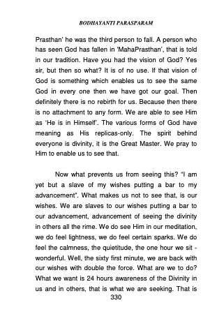 Prasthan’ he was the third person to fall. A person who has seen God has fallen in 'MahaPrasthan’, that is told in our tradition. Have you had the vision of God? Yes sir, but then so what? It is of no use. If that vision of God is something which enables us to see the same God in every one then we have got our goal. Then definitely there is no rebirth for us. Because then there is no attachment to any form. We are able to see Him as ‘He is in Himself’. The various forms of God have meaning as His replicas-only. The spirit behind everyone is divinity, it is the Great Master. We pray to Him to enable us to see that.