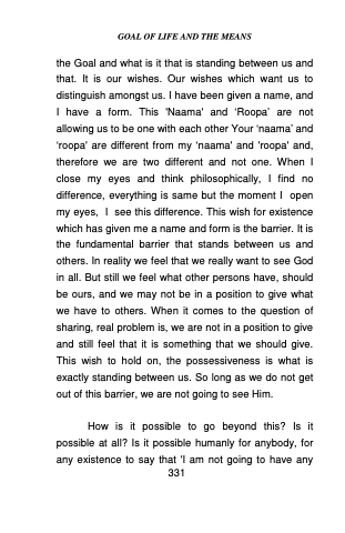 the Goal and what is it that is standing between us and that. It is our wishes. Our wishes which want us to distinguish amongst us. I have been given a name, and I have a form. This 'Naama' and ‘Roopa’ are not allowing us to be one with each other Your ‘naama’ and ‘roopa' are different from my ‘naama' and 'roopa' and, therefore we are two different and not one. When I close my eyes and think philosophically, I find no difference, everything is same but the moment I open my eyes, I see this difference. This wish for existence which has given me a name and form is the barrier. It is the fundamental barrier that stands between us and others. In reality we feel that we really want to see God in all. But still we feel what other persons have, should be ours, and we may not be in a position to give what we have to others. When it comes to the question of sharing, real problem is, we are not in a position to give and still feel that it is something that we should give. This wish to hold on, the possessiveness is what is exactly standing between us. So long as we do not get out of this barrier, we are not going to see Him.
