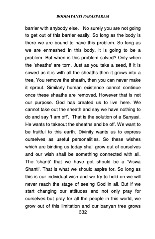 barrier with anybody else. No surely you are not going to get out of this barrier easily. So long as the body is there we are bound to have this problem. So long as we are enmeshed in this body, it is going to be a problem. But when is this problem solved? Only when the 'sheaths' are torn. Just as you take a seed, if it is sowed as it is with all the sheaths then it grows into a tree, You remove the sheath, then you can never make it sprout. Similarly human existence cannot continue once these sheaths are removed. However that is not our purpose. God has created us to live here. We cannot take out the sheath and say we have nothing to do and say ‘I am off’. That is the solution of a Sanyasi. He wants to takeout the sheaths and be off. We want to be fruitful to this earth. Divinity wants us to express ourselves as useful personalities. So these wishes which are binding us today shall grow out of ourselves and our wish shall be something connected with all. The ‘shanti’ that we have got should be a 'Viswa Shanti'. That is what we should aspire for. So long as this is our individual wish and we try to hold on we will never reach the stage of seeing God in all. But if we start changing our attitudes and not only pray for ourselves but pray for all the people in this world, we
