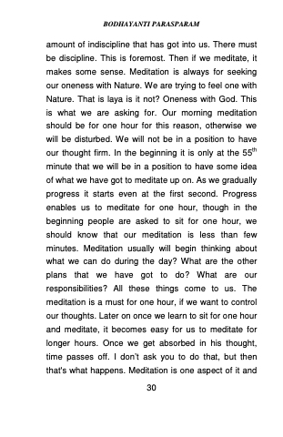 amount of indiscipline that has got into us. There must be discipline. This is foremost. Then if we meditate, it makes some sense. Meditation is always for seeking our oneness with Nature. We are trying to feel one with Nature. That is laya is it not? Oneness with God. This is what we are asking for. Our morning meditation should be for one hour for this reason, otherwise we will be disturbed. We will not be in a position to have our thought firm. In the beginning it is only at the 55th minute that we will be in a position to have some idea of what we have got to meditate up on. As we gradually progress it starts even at the first second. Progress enables us to meditate for one hour, though in the beginning people are asked to sit for one hour, we should know that our meditation is less than few minutes. Meditation usually will begin thinking about what we can do during the day? What are the other plans that we have got to do? What are our responsibilities? All these things come to us. The meditation is a must for one hour, if we want to control our thoughts. Later on once we learn to sit for one hour and meditate, it becomes easy for us to meditate for longer hours. Once we get absorbed in his thought, time passes off. I don’t ask you to do that, but then that's what happens. Meditation is one aspect of it and