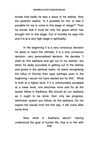 In the beginning it is a very conscious decision he takes to reach the ultimate. It is a very conscious decision, very personalised decision. He decides “I shall do this sadhana and get out of my wishes', but when he really succeeds in getting out of the wishes and grows in the spiritual realm, he starts recognising the influx of Divinity then says 'perhaps even in the beginning I would not have started but for this”. What is truth at a higher level, if it is unfortunately accepted at a lower level, one becomes once and for all the laziest fellow in Sadhana. We should do our sadhana as it ought to be done, then only we progress, whichever system you follow, do the sadhana. Do not expect the results from the first day, it will come after some time.