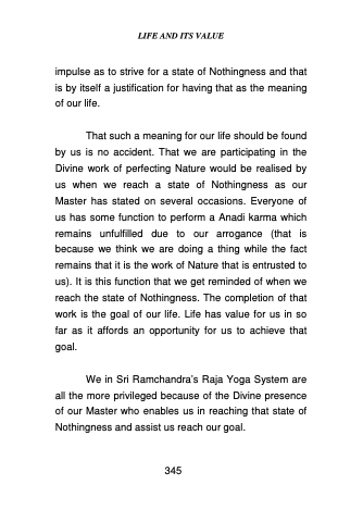 That such a meaning for our life should be found by us is no accident. That we are participating in the Divine work of perfecting Nature would be realised by us when we reach a state of Nothingness as our Master has stated on several occasions. Everyone of us has some function to perform a Anadi karma which remains unfulfilled due to our arrogance (that is because we think we are doing a thing while the fact remains that it is the work of Nature that is entrusted to us). It is this function that we get reminded of when we reach the state of Nothingness. The completion of that work is the goal of our life. Life has value for us in so far as it affords an opportunity for us to achieve that goal.