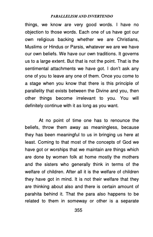 things, we know are very good words. I have no objection to those words. Each one of us have got our own religious backing whether we are Christians, Muslims or Hindus or Parsis, whatever we are we have our own beliefs. We have our own traditions. It governs us to a large extent. But that is not the point. That is the sentimental attachments we have got. I don’t ask any one of you to leave any one of them. Once you come to a stage when you know that there is this principle of parallelity that exists between the Divine and you, then other things become irrelevant to you. You will definitely continue with it as long as you want.
