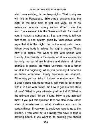 which was existing, is the deep nights. That is why we will find in Pancaratra, Srikrishna’s systems that the night is the best time to get into yoga. Its of no relevance because nobody knows. When I use the word ‘pancaratras’, it is like Greek and Latin for most of you. It makes no sense at all. But I am trying to tell you that there is one system given by Vaasudeva, which says that it is the night that is the most calm hour. When every body is asleep the yogi is awake. That’s how it is stated. We want to live with unison with Divinity. The Divinity is the cause for all our existences not only me but all my brothers and sisters, all other animals, all plants, the whole universe. He is a father for all is the beginning, when you personify it becomes as father otherwise Divinity becomes an abstract. Either way you can take it. It does not matter much. For a yogi it does not matter much. We want to be in tune with it, in tune with nature. So how to get into that state of tune? What is your ultimate goal behind it? What is the ultimate goal? To be in tune. How to you achieve that? If you put this question then we also know under what circumstances or what situations you can do certain things. If you want to cook you have to go to the kitchen. If you want put a drawing you have to take a drawing board. If you want to do painting you should