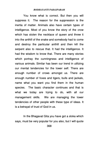 You know what is correct. But then you will suppress it. The reason for the suppression is the inertia of matter. Animals also have certain types of intelligence. Most of you know the story of the crow which has stolen the necklace of queen and threw it into the anthill of the snake and somebody had to come and destroy the particular anthill and then kill the serpent also to rescue that. It had the intelligence. It had the wisdom to know that. There are many stories which portray the cunningness and intelligence of various animals. Similar has been our trend in utilizing our mental tendencies for the lower self. There are enough number of crows amongst us. There are enough number of foxes and tigers, bulls and jackals, name what you want you find them in the human species. The basic character continues and that is what we today are trying to do, with all our management skills. We are managing the lower tendencies of other people with these type of ideas. It is a betrayal of trust of God in us.