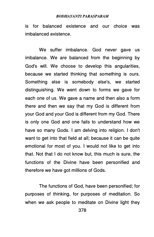 We suffer imbalance. God never gave us imbalance. We are balanced from the beginning by God's will. We choose to develop this angularities, because we started thinking that something is ours. Something else is somebody else's, we started distinguishing. We went down to forms we gave for each one of us. We gave a name and then also a form there and then we say that my God is different from your God and your God is different from my God. There is only one God and one fails to understand how we have so many Gods. I am delving into religion. I don't want to get into that field at all; because it can be quite emotional for most of you. I would not like to get into that. Not that I do not know but, this much is sure, the functions of the Divine have been personified and therefore we have got millions of Gods.