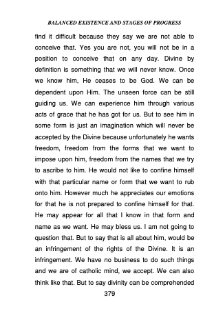 find it difficult because they say we are not able to conceive that. Yes you are not, you will not be in a position to conceive that on any day. Divine by definition is something that we will never know. Once we know him, He ceases to be God. We can be dependent upon Him. The unseen force can be still guiding us. We can experience him through various acts of grace that he has got for us. But to see him in some form is just an imagination which will never be accepted by the Divine because unfortunately he wants freedom, freedom from the forms that we want to impose upon him, freedom from the names that we try to ascribe to him. He would not like to confine himself with that particular name or form that we want to rub onto him. However much he appreciates our emotions for that he is not prepared to confine himself for that. He may appear for all that I know in that form and name as we want. He may bless us. I am not going to question that. But to say that is all about him, would be an infringement of the rights of the Divine. It is an infringement. We have no business to do such things and we are of catholic mind, we accept. We can also think like that. But to say divinity can be comprehended