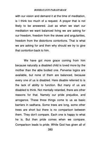 We have got more grace coming from him because naturally a disabled child is loved more by the mother than the able bodied one. Perverse logics are available, but none of them are balanced, because every one of us is disabled. Here disable referred to is the lack of ability to function. But many of us are disabled to think. Not mentally retarded, there are other reasons for that. Namely our pride prejudice, and arrogance. These three things come to us as basic barriers in sadhana. Some trees are long, some other trees are short but there is no comparison between them. They don't compare. Each one is happy to what he is. But then pride comes when we compare. Comparison leads to pride. While God has given all of
