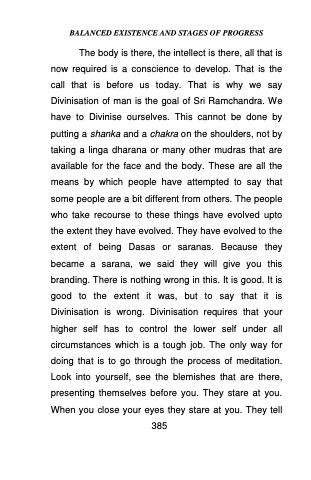 The body is there, the intellect is there, all that is now required is a conscience to develop. That is the call that is before us today. That is why we say Divinisation of man is the goal of Sri Ramchandra. We have to Divinise ourselves. This cannot be done by putting a shanka and a chakra on the shoulders, not by taking a linga dharana or many other mudras that are available for the face and the body. These are all the means by which people have attempted to say that some people are a bit different from others. The people who take recourse to these things have evolved upto the extent they have evolved. They have evolved to the extent of being Dasas or saranas. Because they became a sarana, we said they will give you this branding. There is nothing wrong in this. It is good. It is good to the extent it was, but to say that it is Divinisation is wrong. Divinisation requires that your higher self has to control the lower self under all circumstances which is a tough job. The only way for doing that is to go through the process of meditation. Look into yourself, see the blemishes that are there, presenting themselves before you. They stare at you. When you close your eyes they stare at you. They tell