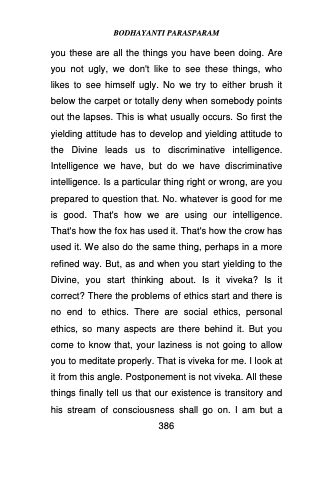 you these are all the things you have been doing. Are you not ugly, we don't like to see these things, who likes to see himself ugly. No we try to either brush it below the carpet or totally deny when somebody points out the lapses. This is what usually occurs. So first the yielding attitude has to develop and yielding attitude to the Divine leads us to discriminative intelligence. Intelligence we have, but do we have discriminative intelligence. Is a particular thing right or wrong, are you prepared to question that. No. whatever is good for me is good. That's how we are using our intelligence. That's how the fox has used it. That's how the crow has used it. We also do the same thing, perhaps in a more refined way. But, as and when you start yielding to the Divine, you start thinking about. Is it viveka? Is it correct? There the problems of ethics start and there is no end to ethics. There are social ethics, personal ethics, so many aspects are there behind it. But you come to know that, your laziness is not going to allow you to meditate properly. That is viveka for me. I look at it from this angle. Postponement is not viveka. All these things finally tell us that our existence is transitory and his stream of consciousness shall go on. I am but a 386