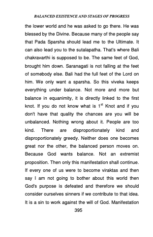 the lower world and he was asked to go there. He was blessed by the Divine. Because many of the people say that Pada Sparsha should lead me to the Ultimate. It can also lead you to the sutalapatha. That's where Bali chakravarthi is supposed to be. The same feet of God, brought him down. Saranagati is not falling at the feet of somebody else. Bali had the full feet of the Lord on him. We only want a sparsha. So this viveka keeps everything under balance. Not more and more but balance in equanimity, it is directly linked to the first knot. If you do not know what is 1st Knot and if you don't have that quality the chances are you will be unbalanced. Nothing wrong about it. People are too kind. There are disproportionately kind and disproportionately greedy. Neither does one becomes great nor the other, the balanced person moves on. Because God wants balance. Not an extremist proposition. Then only this manifestation shall continue. If every one of us were to become viraktas and then say I am not going to bother about this world then God's purpose is defeated and therefore we should consider ourselves sinners if we contribute to that idea. It is a sin to work against the will of God. Manifestation