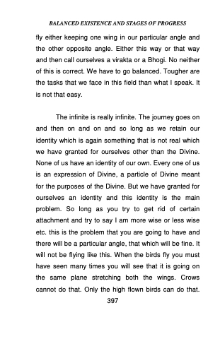 The infinite is really infinite. The journey goes on and then on and on and so long as we retain our identity which is again something that is not real which we have granted for ourselves other than the Divine. None of us have an identity of our own. Every one of us is an expression of Divine, a particle of Divine meant for the purposes of the Divine. But we have granted for ourselves an identity and this identity is the main problem. So long as you try to get rid of certain attachment and try to say I am more wise or less wise etc. this is the problem that you are going to have and there will be a particular angle, that which will be fine. It will not be flying like this. When the birds fly you must have seen many times you will see that it is going on the same plane stretching both the wings. Crows cannot do that. Only the high flown birds can do that.