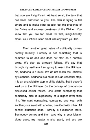 Then another great value of spirituality comes namely humility. Humility is not something that is common to us and one does not start as a humble being. We start as arrogant fellows. We say that through my sadhana I am going to reach the Ultimate. No, Sadhana is a must. We do not reach the Ultimate by Sadhana. Sadhana is a must. It is an essential step. It is an unavoidable step in all its details. But it doesn’t lead us to the Ultimate. So the concept of comparison discussed earlier recurs. One starts comparing that somebody else is supposedly at a higher level than him. We start comparing, comparing one yogi with another, one saint with another, one God with other. All conflict situations arise. Humility is questioned there. Somebody comes and then says why is your Master alone good, my master is also good, and you are