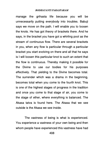 manage the grihasta life because you will be unnecessarily putting everybody into troubles. Babuji says we move on the path. I will enable you to loosen the knots. He has got theory of brackets there. And he says, in the bracket you have got a whirling pool as the stream of continuous flow. There are several brackets in you, when any flow is particular through a particular bracket you start evolving on there and all that he says is I will loosen this particular knot to such an extent that the flow is continuous. Thereby making it possible for the Divine to use our bodies for his purposes effectively. That yielding to the Divine becomes total. The surrender which was a drama in the beginning, becomes total when you come to the fourth knot. This is one of the highest stages of progress in the tradition and once you come to that stage of air, you come to the stage of ether, where everything is balanced. The Akasa tatva is found here. The Akasa that we see outside is the Akasa we see inside.