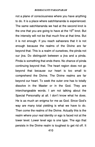 not a plane of consciousness where you have anything to do. It is a place where satchitananda is experienced. The same satchitananda we had at the second knot is the one that you are going to have at the 10th knot. But the intensity will not be that much fine at that time. But it is not enough. If you reach sahasrara that it is not enough because the realms of the Divine are far beyond that. This is a realm of ourselves, the pinda not our jiva. Do distinguish between a jiva and a pinda. Pinda is something that ends there. No chance of pinda continuing beyond that. The heart region does not go beyond that because our heart is too small to comprehend the Divine. The Divine realms are far beyond our heart. To seek the outer one has to totally dissolve in the Master or in the God. They are interchangeable words. I am not talking about the Special Personality at all. I don’t know what he does. He is as much an enigma for me as God. Since God’s way are many total yielding is what we have to do. Then come the realms of the Divine. Actually this is the realm where your real identity or ego is faced not at the lower level. Lower level ego is one type. The ego that persists in the Divine realm is toughest to get rid off. It 410