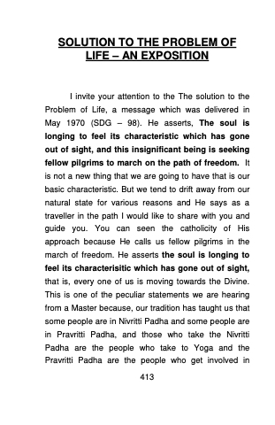 I invite your attention to the The solution to the Problem of Life, a message which was delivered in May 1970 (SDG – 98). He asserts, The soul is longing to feel its characteristic which has gone out of sight, and this insignificant being is seeking fellow pilgrims to march on the path of freedom. It is not a new thing that we are going to have that is our basic characteristic. But we tend to drift away from our natural state for various reasons and He says as a traveller in the path I would like to share with you and guide you. You can seen the catholicity of His approach because He calls us fellow pilgrims in the march of freedom. He asserts the soul is longing to feel its characterisitic which has gone out of sight, that is, every one of us is moving towards the Divine. This is one of the peculiar statements we are hearing from a Master because, our tradition has taught us that some people are in Nivritti Padha and some people are in Pravritti Padha, and those who take the Nivritti Padha are the people who take to Yoga and the Pravritti Padha are the people who get involved in