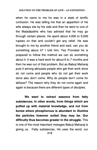 We want to extract essence from fatty substances; in other words, from things which are puffed up with material knowledge, and not from bones where phosphorous is abundant to illumine the particles however soiled they may be. Our difficulty thus becomes greater in the struggle. This is one of the most important messges Babuji Maharaj is