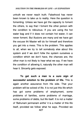 untruth we never reach truth. Falsehood has never been known to take us to reality. Here the question is fomenting. Unless we have got the capacity to foment the others, to say that I foment the other person with the condition to ridiculous. If you are using the hot water bag and if it does not contain hot water, it can never foment. But illusions are many and we have got the excuse tht Master will do for himself and therefore you get into a mess. This is the problem. This applies to all, when we try to tell somebody else about this system and if we don’t follw the system ourselves a condition which we don’t have, the chances are, the other man is not likely to hear what we say. If we have the condition of allowing it, naturally the other man will hear it. Sincerity gets exposed.