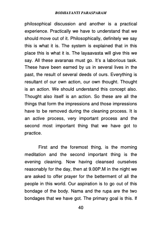 philosophical discussion and another is a practical experience. Practically we have to understand that we should move out of it. Philosophically, definitely we say this is what it is. The system is explained that in this place this is what it is. The layaavasta will give this we say. All these avaranas must go. It’s a laborious task. These have been earned by us in several lives in the past, the result of several deeds of ours. Everything is resultant of our own action, our own thought. Thought is an action. We should understand this concept also. Thought also itself is an action. So these are all the things that form the impressions and those impressions have to be removed during the cleaning process. It is an active process, very important process and the second most important thing that we have got to practice.