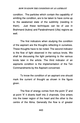 The first indicators when studying the condition of the aspirant are the thoughts reflecting in ourselves. These thoughts have to be noted. The second indicator is the flow of light observed in the various knots. We shall be discussing the light pertaining to the various knots later in the article. The third indicator of an aspirants condition is the implementation of the Ten Commandments by the Aspirant concerned.