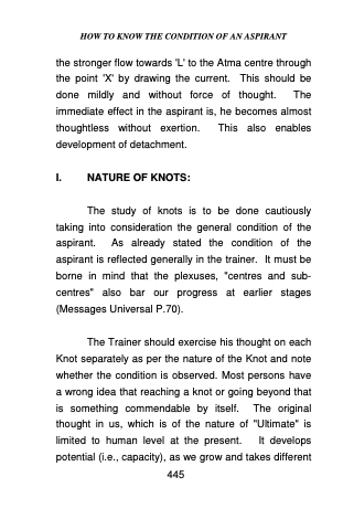 The study of knots is to be done cautiously taking into consideration the general condition of the aspirant. As already stated the condition of the aspirant is reflected generally in the trainer. It must be borne in mind that the plexuses, "centres and sub- centres" also bar our progress at earlier stages (Messages Universal P.70).