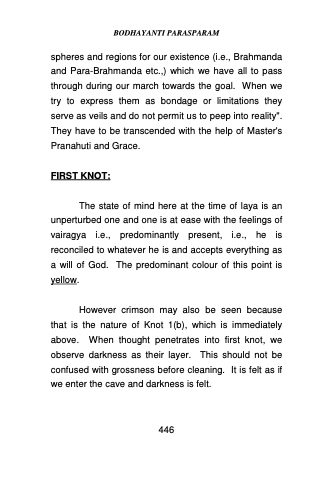 spheres and regions for our existence (i.e., Brahmanda and Para-Brahmanda etc.,) which we have all to pass through during our march towards the goal. When we try to express them as bondage or limitations they serve as veils and do not permit us to peep into reality". They have to be transcended with the help of Master's Pranahuti and Grace.