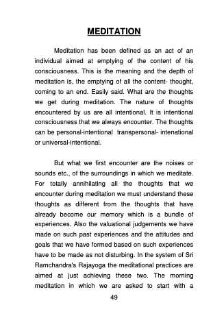 But what we first encounter are the noises or sounds etc., of the surroundings in which we meditate. For totally annihilating all the thoughts that we encounter during meditation we must understand these thoughts as different from the thoughts that have already become our memory which is a bundle of experiences. Also the valuational judgements we have made on such past experiences and the attitudes and goals that we have formed based on such experiences have to be made as not disturbing. In the system of Sri Ramchandra's Rajayoga the meditational practices are aimed at just achieving these two. The morning meditation in which we are asked to start with a