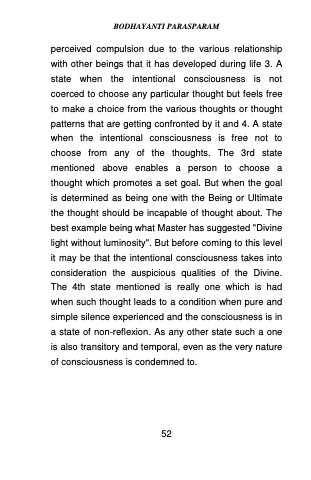 perceived compulsion due to the various relationship with other beings that it has developed during life 3. A state when the intentional consciousness is not coerced to choose any particular thought but feels free to make a choice from the various thoughts or thought patterns that are getting confronted by it and 4. A state when the intentional consciousness is free not to choose from any of the thoughts. The 3rd state mentioned above enables a person to choose a thought which promotes a set goal. But when the goal is determined as being one with the Being or Ultimate the thought should be incapable of thought about. The best example being what Master has suggested "Divine light without luminosity". But before coming to this level it may be that the intentional consciousness takes into consideration the auspicious qualities of the Divine. The 4th state mentioned is really one which is had when such thought leads to a condition when pure and simple silence experienced and the consciousness is in a state of non-reflexion. As any other state such a one is also transitory and temporal, even as the very nature of consciousness is condemned to.
