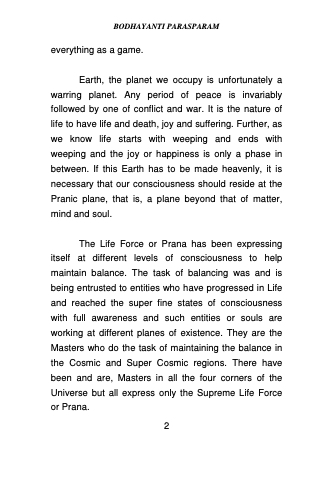 Earth, the planet we occupy is unfortunately a warring planet. Any period of peace is invariably followed by one of conflict and war. It is the nature of life to have life and death, joy and suffering. Further, as we know life starts with weeping and ends with weeping and the joy or happiness is only a phase in between. If this Earth has to be made heavenly, it is necessary that our consciousness should reside at the Pranic plane, that is, a plane beyond that of matter, mind and soul.