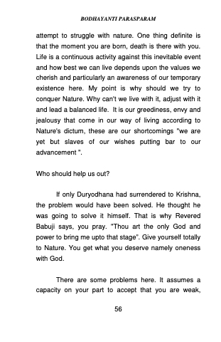 If only Duryodhana had surrendered to Krishna, the problem would have been solved. He thought he was going to solve it himself. That is why Revered Babuji says, you pray. "Thou art the only God and power to bring me upto that stageā. Give yourself totally to Nature. You get what you deserve namely oneness with God.