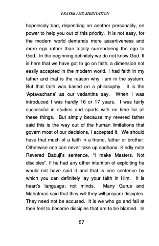 hopelessly bad, depending on another personality, on power to help you out of this priority. It is not easy, for the modern world demands more assertiveness and more ego rather than totally surrendering the ego to God. In the beginning definitely we do not know God. It is here that we have got to go on faith, a dimension not easily accepted in the modern world. I had faith in my father and that is the reason why I am in the system. But that faith was based on a philosophy. It is the ‘Aptavachana’ as our vedantins say. When I was introduced I was hardly 16 or 17 years. I was fairly successful in studies and sports with no time for all these things. But simply because my revered father said this is the way out of the human limitations that govern most of our decisions, I accepted it. We should have that much of a faith in a friend, father or brother. Otherwise one can never take up sadhana. Kindly note Revered Babuji’s sentence, “I make Masters. Not disciples”. If he had any other intention of exploiting he would not have said it and that is one sentence by which you can definitely lay your faith in Him. It is heart’s language; not minds. Many Gurus and Mahatmas said that they will they will prepare disciples. They need not be accused. It is we who go and fall at their feet to become disciples that are to be blamed. In