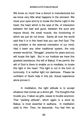 We know so much how a biscuit is manufactured but we know very little what happens in the stomach. We close your eyes and try to locate the Divine Light in the heart, the heart which is the seat of life, of interaction between the bad and good, between the pure and impure blood, the small muscle, the functioning of which we just do not know. Saints all over the world said that it is in this heart that you can find God. The only problem is the external orientation of our mind. Had it been any other traditional system, the only answer would be, "Struggle", practice for years and you will locate this light. But in our Institute we have this greatest assistance, the will of Babuji. If we permit, the will of God is there to enable us to meditate, to locate this light in the heart. This light is not in the form of luminosity. It is neither light nor darkness. Please be confident of God's help in this job. Actual experience alone proves it.