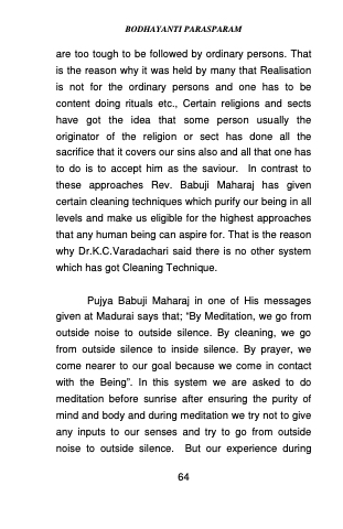 are too tough to be followed by ordinary persons. That is the reason why it was held by many that Realisation is not for the ordinary persons and one has to be content doing rituals etc., Certain religions and sects have got the idea that some person usually the originator of the religion or sect has done all the sacrifice that it covers our sins also and all that one has to do is to accept him as the saviour. In contrast to these approaches Rev. Babuji Maharaj has given certain cleaning techniques which purify our being in all levels and make us eligible for the highest approaches that any human being can aspire for. That is the reason why Dr.K.C.Varadachari said there is no other system which has got Cleaning Technique.
