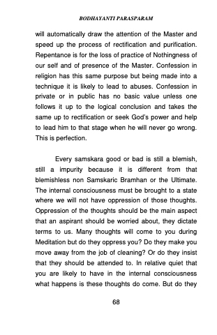 will automatically draw the attention of the Master and speed up the process of rectification and purification. Repentance is for the loss of practice of Nothingness of our self and of presence of the Master. Confession in religion has this same purpose but being made into a technique it is likely to lead to abuses. Confession in private or in public has no basic value unless one follows it up to the logical conclusion and takes the same up to rectification or seek God’s power and help to lead him to that stage when he will never go wrong. This is perfection.