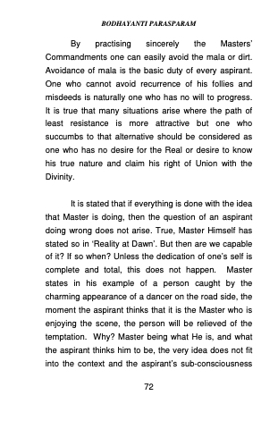 By practising sincerely the Masters’ Commandments one can easily avoid the mala or dirt. Avoidance of mala is the basic duty of every aspirant. One who cannot avoid recurrence of his follies and misdeeds is naturally one who has no will to progress. It is true that many situations arise where the path of least resistance is more attractive but one who succumbs to that alternative should be considered as one who has no desire for the Real or desire to know his true nature and claim his right of Union with the Divinity.