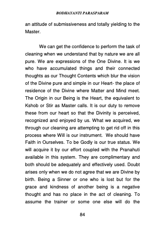We can get the confidence to perform the task of cleaning when we understand that by nature we are all pure. We are expressions of the One Divine. It is we who have accumulated things and their connected thoughts as our Thought Contents which blur the vision of the Divine pure and simple in our Heart- the place of residence of the Divine where Matter and Mind meet. The Origin in our Being is the Heart, the equivalent to Kshob or Stir as Master calls. It is our duty to remove these from our heart so that the Divinity is perceived, recognized and enjoyed by us. What we acquired, we through our cleaning are attempting to get rid off in this process where Will is our instrument. We should have Faith in Ourselves. To be Godly is our true status. We will acquire it by our effort coupled with the Pranahuti available in this system. They are complimentary and both should be adequately and effectively used. Doubt arises only when we do not agree that we are Divine by birth. Being a Sinner or one who is lost but for the grace and kindness of another being is a negative thought and has no place in the act of cleaning. To assume the trainer or some one else will do the
