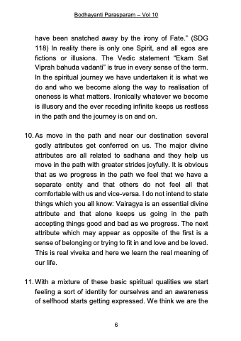 10.As move in the path and near our destination several godly attributes get conferred on us. The major divine attributes are all related to sadhana and they help us move in the path with greater strides joyfully. It is obvious that as we progress in the path we feel that we have a separate entity and that others do not feel all that comfortable with us and vice-versa. I do not intend to state things which you all know: Vairagya is an essential divine attribute and that alone keeps us going in the path accepting things good and bad as we progress. The next attribute which may appear as opposite of the first is a sense of belonging or trying to fit in and love and be loved. This is real viveka and here we learn the real meaning of our life.