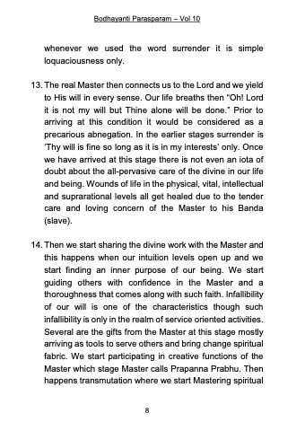14. Then we start sharing the divine work with the Master and this happens when our intuition levels open up and we start finding an inner purpose of our being. We start guiding others with confidence in the Master and a thoroughness that comes along with such faith. Infallibility of our will is one of the characteristics though such infallibility is only in the realm of service oriented activities. Several are the gifts from the Master at this stage mostly arriving as tools to serve others and bring change spiritual fabric. We start participating in creative functions of the Master which stage Master calls Prapanna Prabhu. Then happens transmutation where we start Mastering spiritual