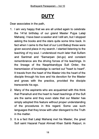1. I am very happy that we are all united again to celebrate the 141st birthday of our grand Master Pujya Lalaji Maharaj. I have been a seeker and I still am, but I stopped asking the books and the stars quite some time back. In fact when I came to the feet of our Lord Babuji these were given second place in my search. I started listening to the teaching of my soul. I understood much later that Sufism and Santmat and “Samarpan (let-go) and constant remembrance are the driving forces of his teachings. In the lineage of the Naqshbandiyya Sufi Order, the transmission of knowledge is carried out "heart to heart". It travels from the heart of the Master into the heart of the disciple through his love and his devotion for the Master and grows with the practice, provided the disciple transcends his ego.