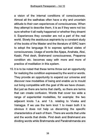a vision of the internal conditions of consciousness. Almost all the sadhakas often have a shy and uncertain attitude to their own experiences of consciousness. When they attempt to describe them, it is as if they were not too sure whether it all realty happened or whether they dreamt it. Experiences they consider are not a part of the real world. Slowly the assiduous aspirants by a constant study of the books of the Master and the literature of ISRC learn to adopt the language fit to express spiritual states of consciousness. Usage of words like Ajapa, Anahata, Aksi, Kasbi, Pind desh, Brahmand consciousness, Prapanna condition etc. becomes easy with more and more of practice of meditation in this system.