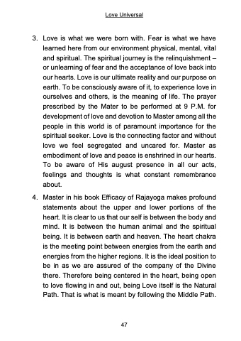 3. Love is what we were born with. Fear is what we have learned here from our environment physical, mental, vital and spiritual. The spiritual journey is the relinquishment – or unlearning of fear and the acceptance of love back into our hearts. Love is our ultimate reality and our purpose on earth. To be consciously aware of it, to experience love in ourselves and others, is the meaning of life. The prayer prescribed by the Mater to be performed at 9 P.M. for development of love and devotion to Master among all the people in this world is of paramount importance for the spiritual seeker. Love is the connecting factor and without love we feel segregated and uncared for. Master as embodiment of love and peace is enshrined in our hearts. To be aware of His august presence in all our acts, feelings and thoughts is what constant remembrance about.
