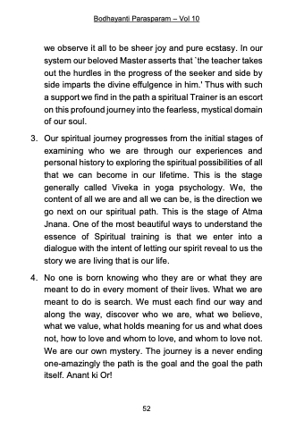 3. Our spiritual journey progresses from the initial stages of examining who we are through our experiences and personal history to exploring the spiritual possibilities of all that we can become in our lifetime. This is the stage generally called Viveka in yoga psychology. We, the content of all we are and all we can be, is the direction we go next on our spiritual path. This is the stage of Atma Jnana. One of the most beautiful ways to understand the essence of Spiritual training is that we enter into a dialogue with the intent of letting our spirit reveal to us the story we are living that is our life.